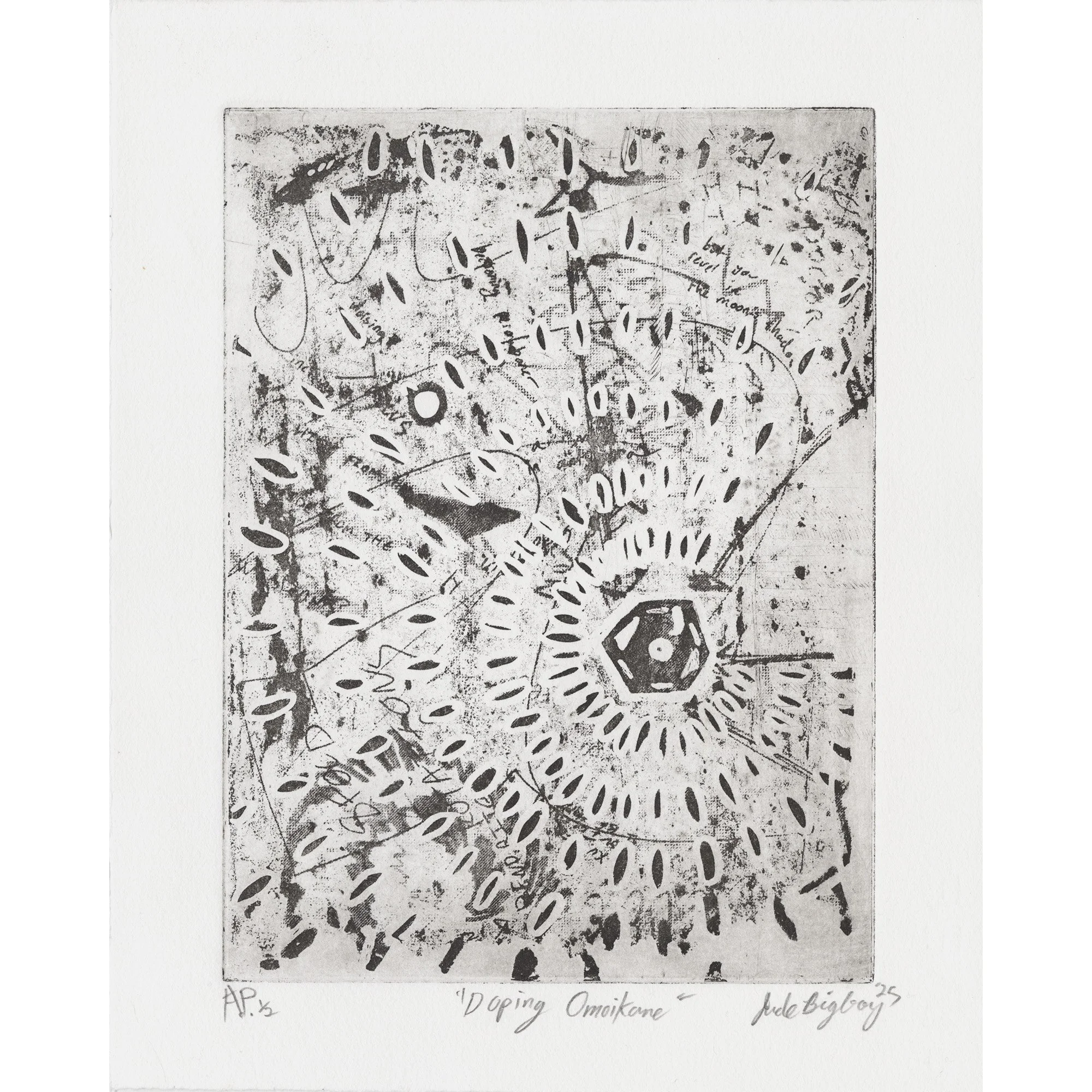Jude Bigboy is a printmaker and multimedia artist born in and currently working in Philadelphia, PA. They are a proud member of the Bad River Band of Chippewa Indians. Jude's intuitive and research-based practice serves as a way to process new ideas and feelings alongside the development of their imagery. Their work is invested in the printmaking process and how the vast array of print techniques can mimic or alter existing concepts in other fields of interest. Specifically, they are interested in technological, theological, and psychological concepts - and how they work in tandem or contradict each other.